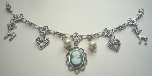 1 Kunststoffkamee in grün, 2 Kunststoff- oder Glasperlen (können je nach Vorrat etwas abweichen), 2 Metallanhänger Herz und 2 Metallanhänger Hirsch