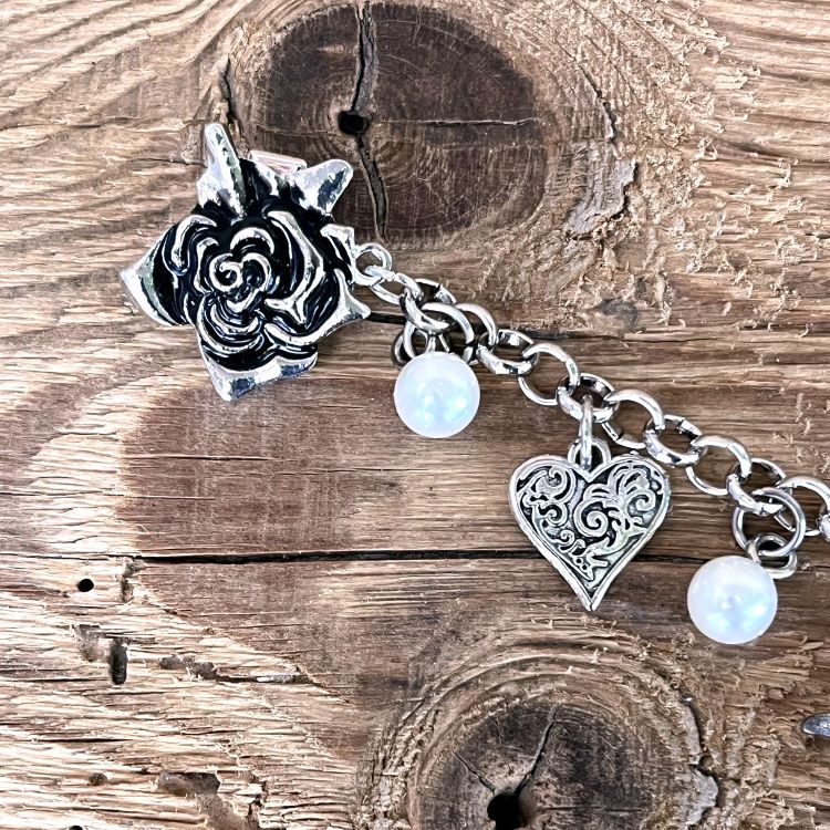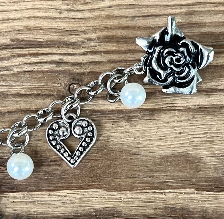 Sehr dekoratives Steck-Charivari mit 5 antik-silberfarbenen Trachtenanhängern aus Metall und sechs Schmuckperlen aus Kunststoff.