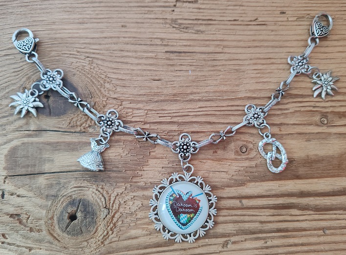 Das Charivari besteht aus einer dekorativ verzierten Kette mit 4 kleinen antik-silberfarbenen Trachtenanhängern aus Metall und 1 Anhänger mit Glasschmuckstein mit dem Serienlogo „Lebkuchenherz“.