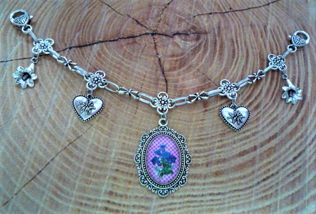 1 Glascabochonanhänger mit Enzianmotiv, 2 Herzen mit Edelweiß und 2 Enziananhänger