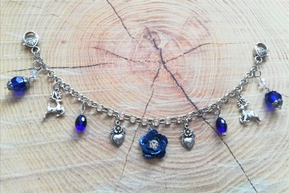 1 Charivari / Dirndlschmuck / Miederschmuck /Schürzenschmuck einreihig mit 9 fest angebrachten Trachtenanhängern Glasschliffperlen in blau, klar, Emailleanhänger, Metallanhänger Die Kette hat mit den 2 verzierten Karabinerhaken eine Länge von ca. 27 cm. Größe Kettenglied ca. 6 mm Größe Anhänger ca. 18 bis 30 mm ==> Upcycling aus Alpenflüstern-Schmuckkomponenten! Sie erhalten das Charivari hübsch verpackt in einem Schmucksäckchen.
