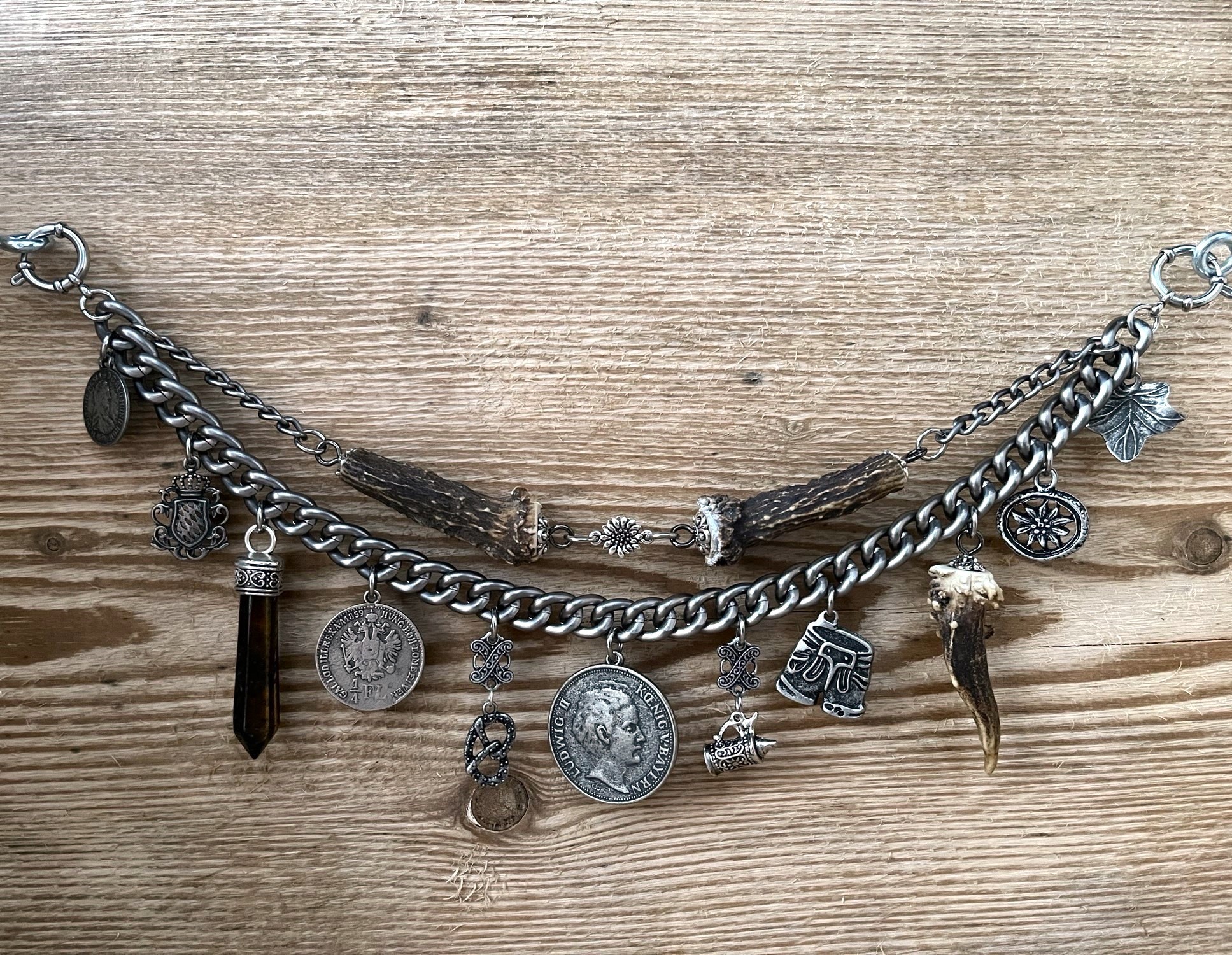 In die obere Kette sind zwei sehr dekorative Rehhornstücke eingearbeitet, diese können von der Abbildung abweichen, da jedes Horn ein Einzelstück ist.