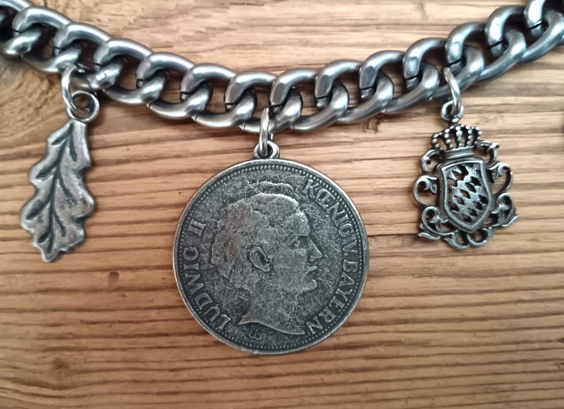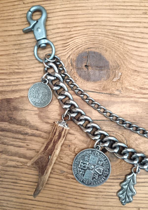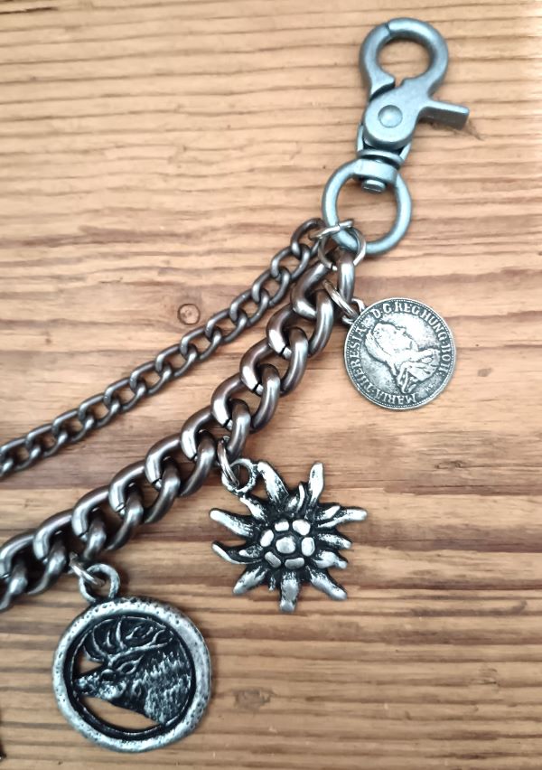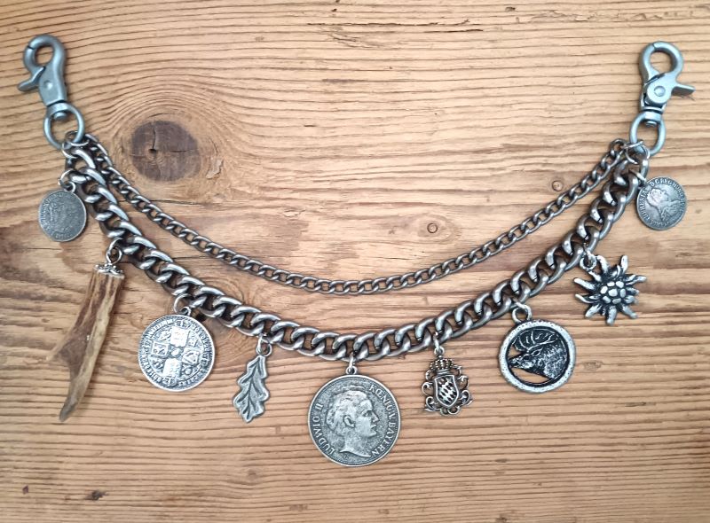zweireihiges Charivari mit 9 fest angebrachten, sehr hochwertigen Trachtenanhängern aus Metall und Echthorn