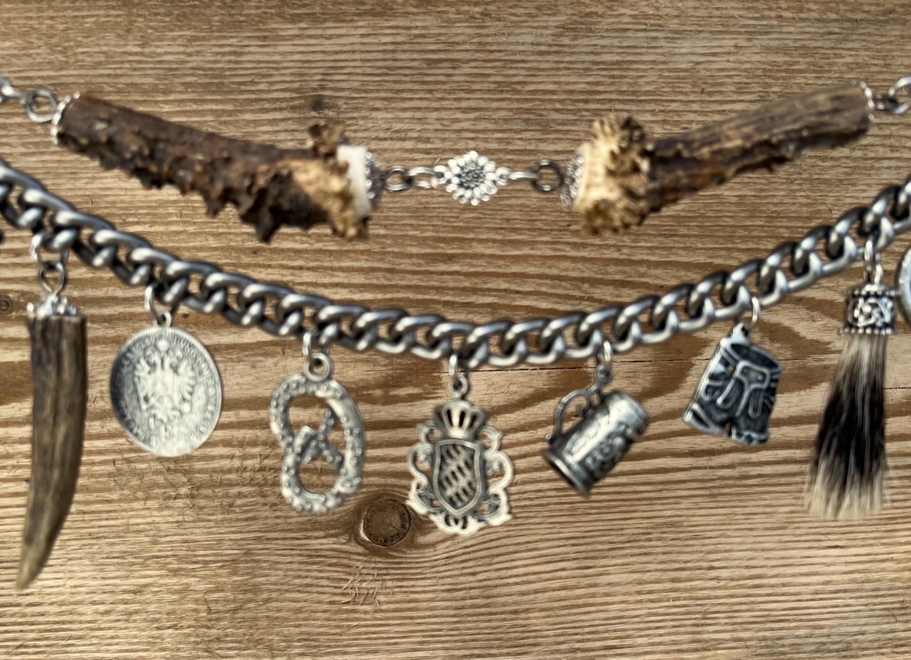 1 Lederhosen-Charivari, zweireihig, Unikat, 11 Anhänger, antik-silberfarben, ca. 33 cm