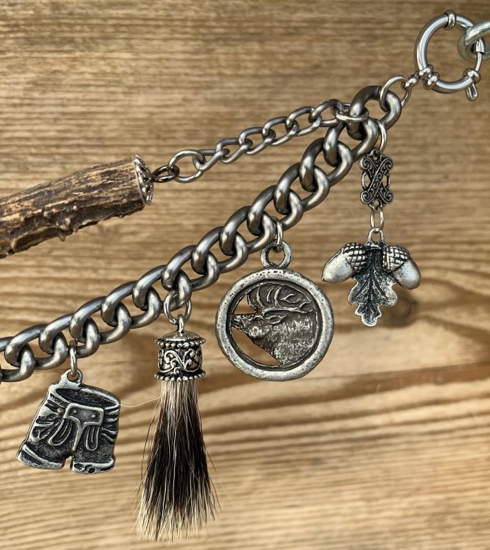 mit 11 fest angebrachten, sehr hochwertigen Trachtenanhängern aus Metall, Rehhorn und Dachshaar
