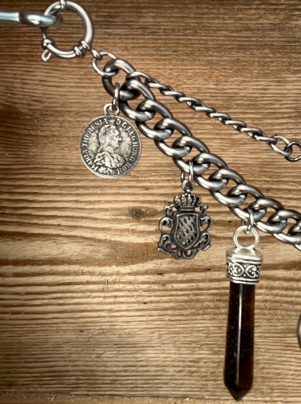 mit 11 fest angebrachten, sehr hochwertigen Trachtenanhängern aus Metall, und Schmuckstein Tigerauge und Rehhorn.