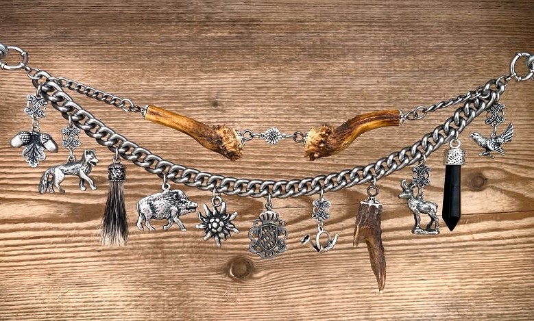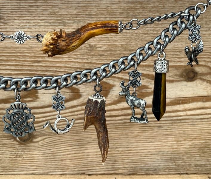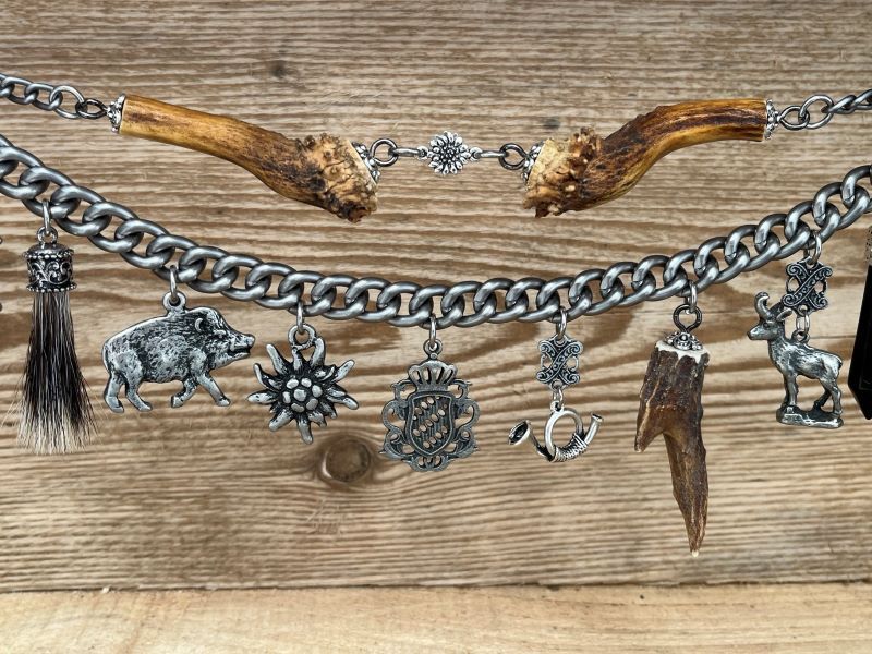mit 11 fest angebrachten, sehr hochwertigen Trachtenanhängern aus Metall, Dachshaar, Rehhhorn und einem Schmuckedelstein Tigerauge