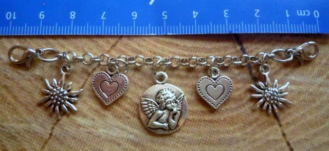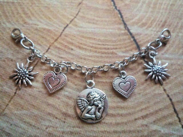 Auch kleine Mädchen möchten ihr Dirndl gerne mit hübschen Schmuckstücken verzieren. Das Charivari hat 5 fest angebrachte Trachtenanhänger aus Metall, antik-silberfarben. Motive: Engel, Herzen und Edelweiß
