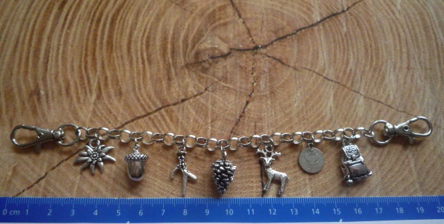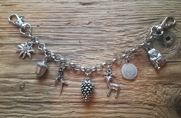 Das Charivari hat 7 fest angebrachte Trachtenanhänger aus Metall, antik-silberfarben.