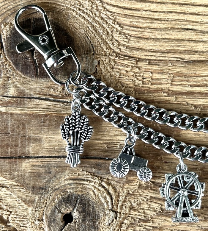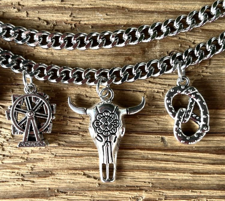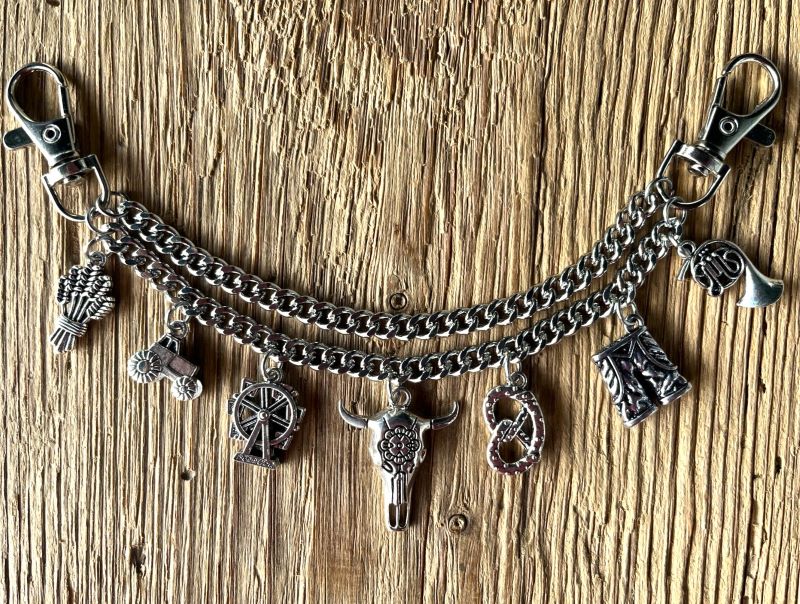 Das Charivari hat 7 fest angebrachte Trachtenanhänger aus Metall in antik-silberfarben