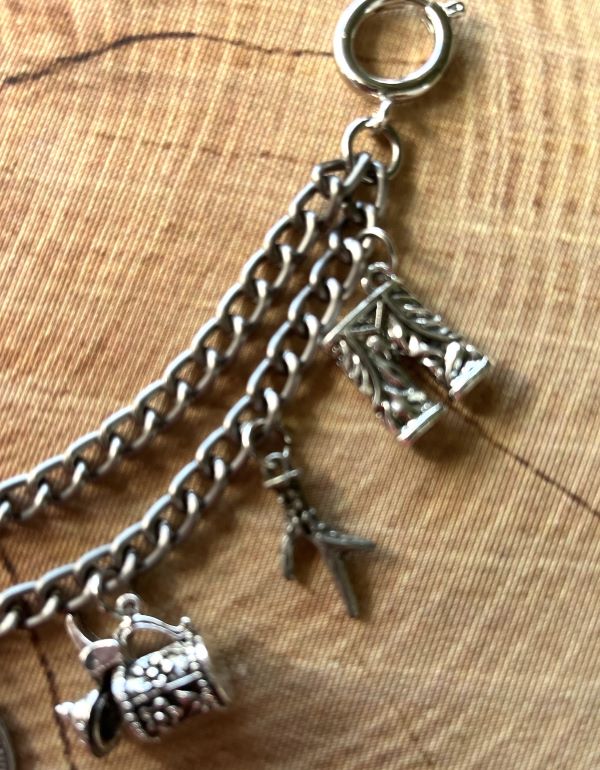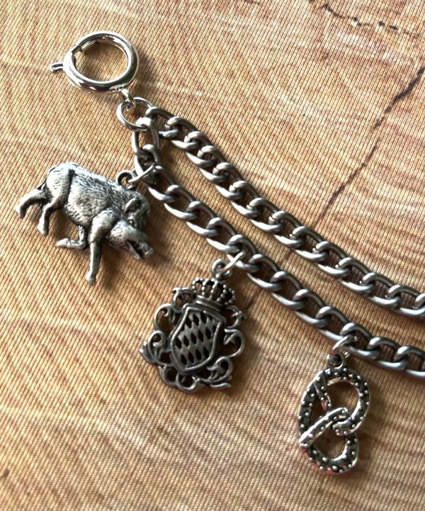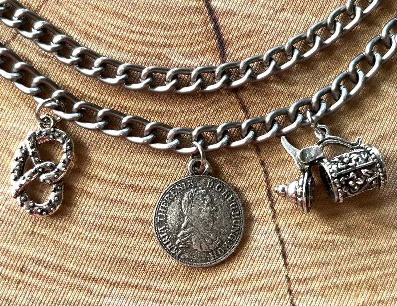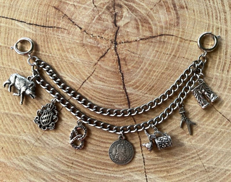 Das Charivari hat 7 fest angebrachte sehr hochwertige Trachtenanhänger aus Metall in antik-silberfarben (dunkel)