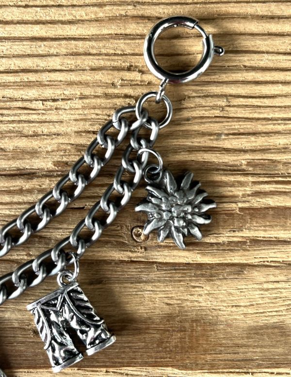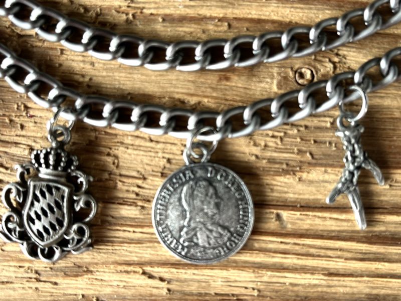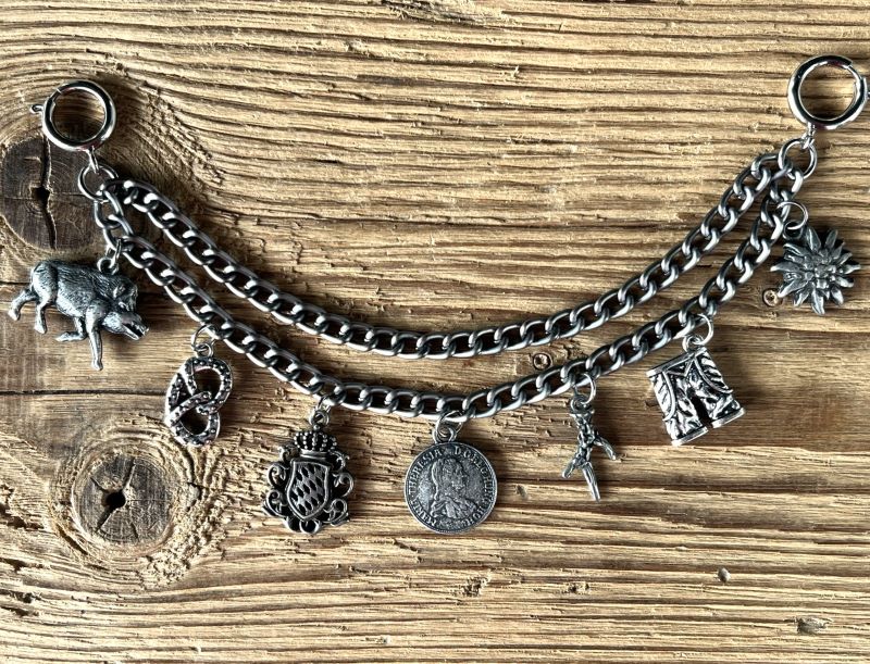 Das Charivari hat 6 fest angebrachte sehr hochwertige Trachtenanhänger aus Metall in antik-silberfarben (dunkel)