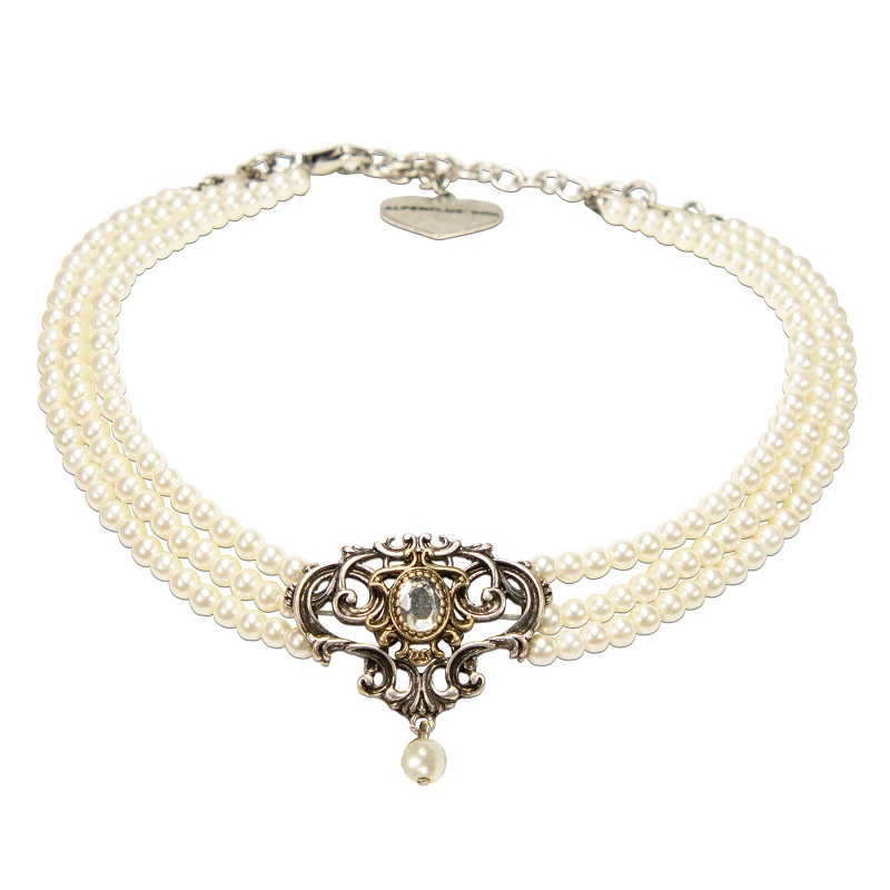 Das bicolor-farbene Mittelelement ist mit einem Strass-Stein und einer hängenden Perle verziert. Eine elegante Dirndlkette und zeitlos schön.