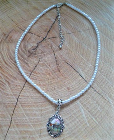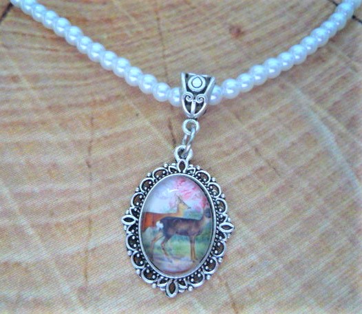 Kette mit weißen kleinen Glasperlen und einem schönen Glas-Cabochonanhänger mit Rehemotiv
