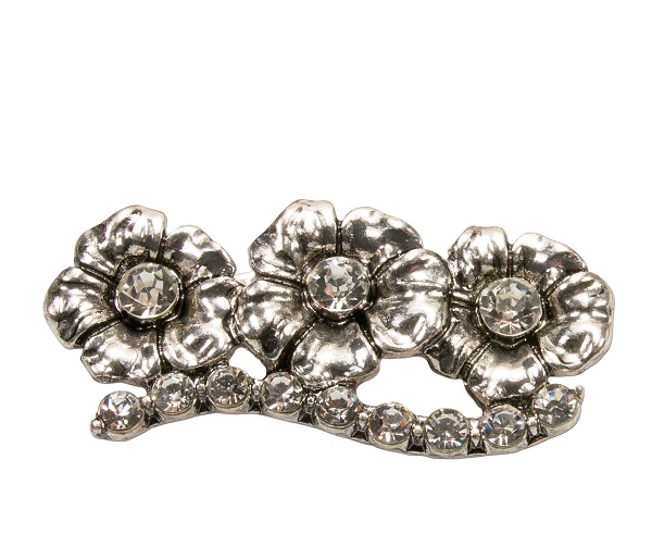 Die Blusenbrosche ist mit 3 Blüten verziert und wird von einem geschwungenenm Strassbogen getragen.