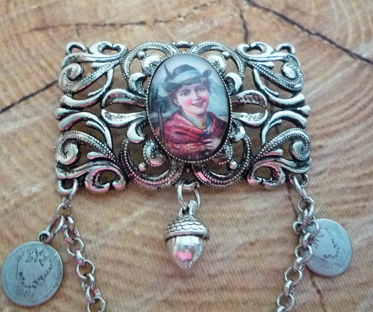 verziert mit einem Glascabochonstein mit Frauenmotiv (18 x 25 mm) und einem Eichelanhänger