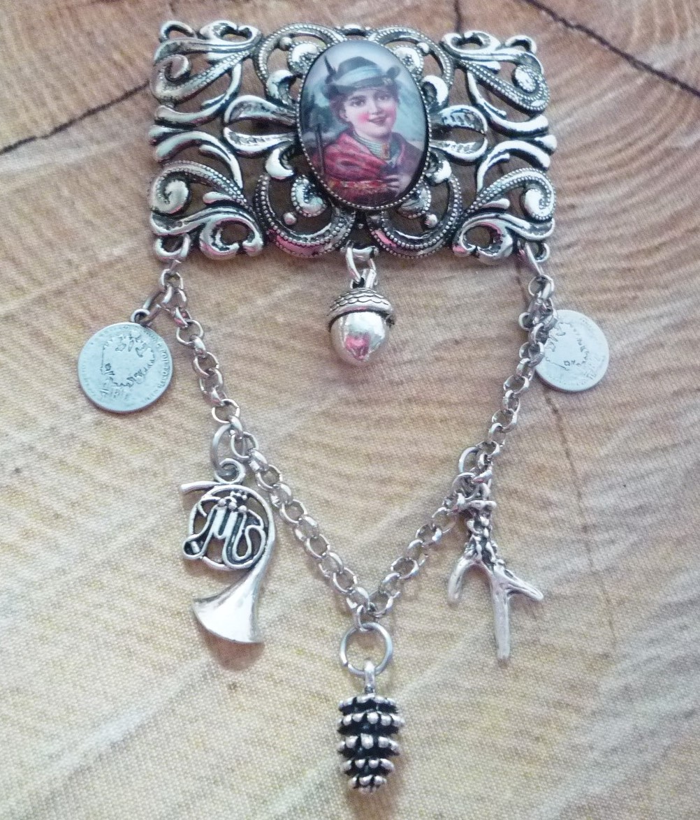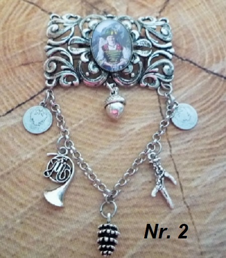 Kettchen ergänzt mit 5 weiteren kleinen Metall-Trachtenanhängern in antik-silberfarben ( Geweih, Zapfen, Horn, Münzen)