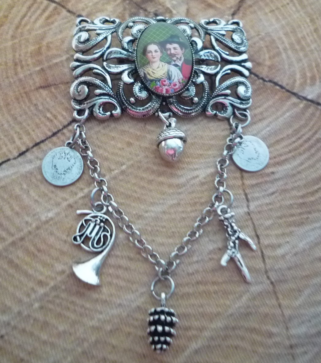 Kettchen ergänzt mit 5 weiteren kleinen Metall-Trachtenanhängern in antik-silberfarben ( Geweih, Zapfen, Horn, Münzen)