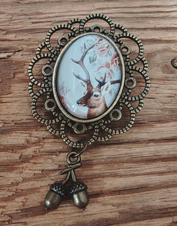 Trachtenbrosche mit Glascabochon mit Hirschkopfmotiv