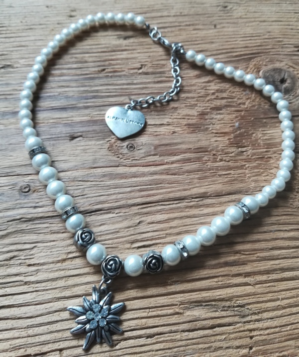 - Länge Trachten Halskette: ca. 41 cm + 7 cm Verlängerungs-Kette, Edelweiss-Anhänger mit Glitzer-Steinen: ca. 2 x 2 cm
